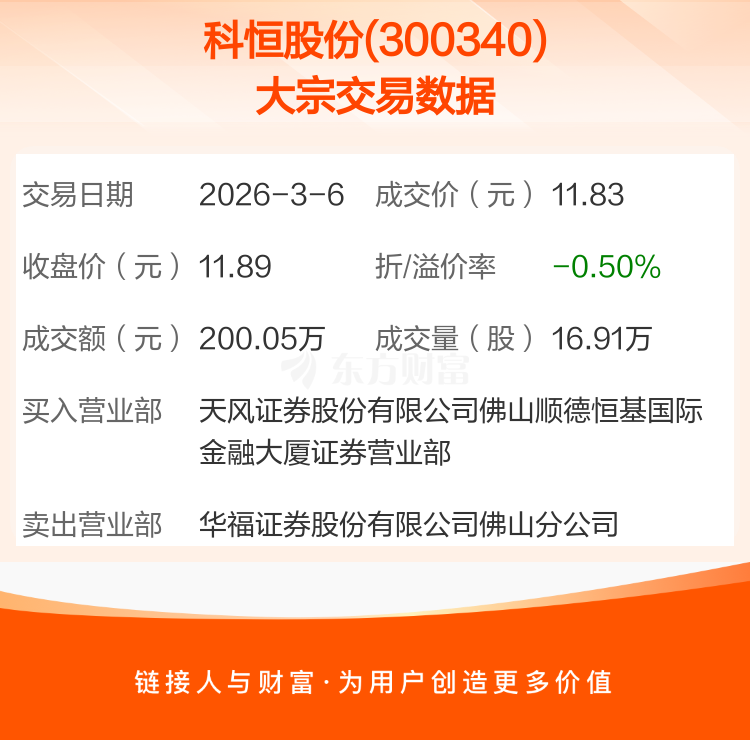2026年3月6日,科恒股份发生1笔大宗交易,共成交16.91万股,成交金额200.05万元,占其流通市值比例为0.06%。