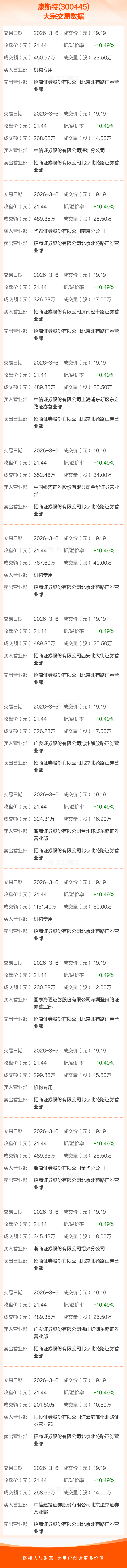 大宗交易:康斯特成交8059.83万元,折价10.49%(3-6)