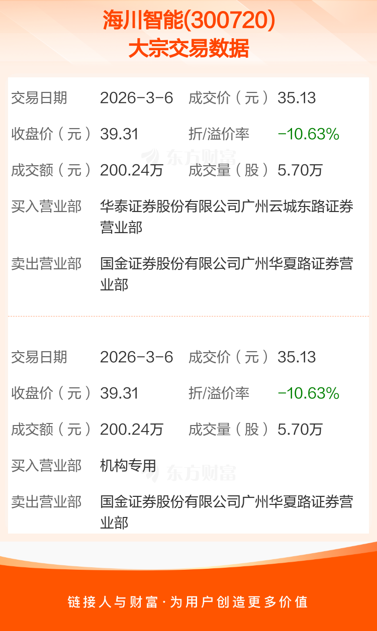 2026年3月6日,海川智能发生2笔大宗交易,共成交11.40万股,成交金额400.48万元,占其流通市值比例为0.06%。