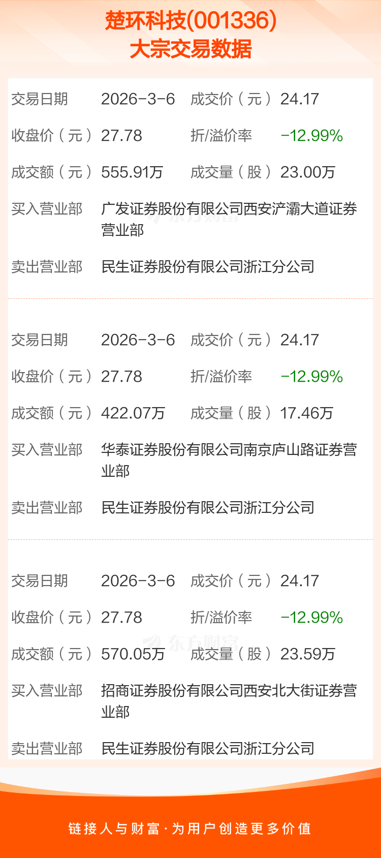2026年3月6日,楚环科技发生3笔大宗交易,共成交64.05万股,成交金额1548.03万元,占其流通市值比例为1.20%。