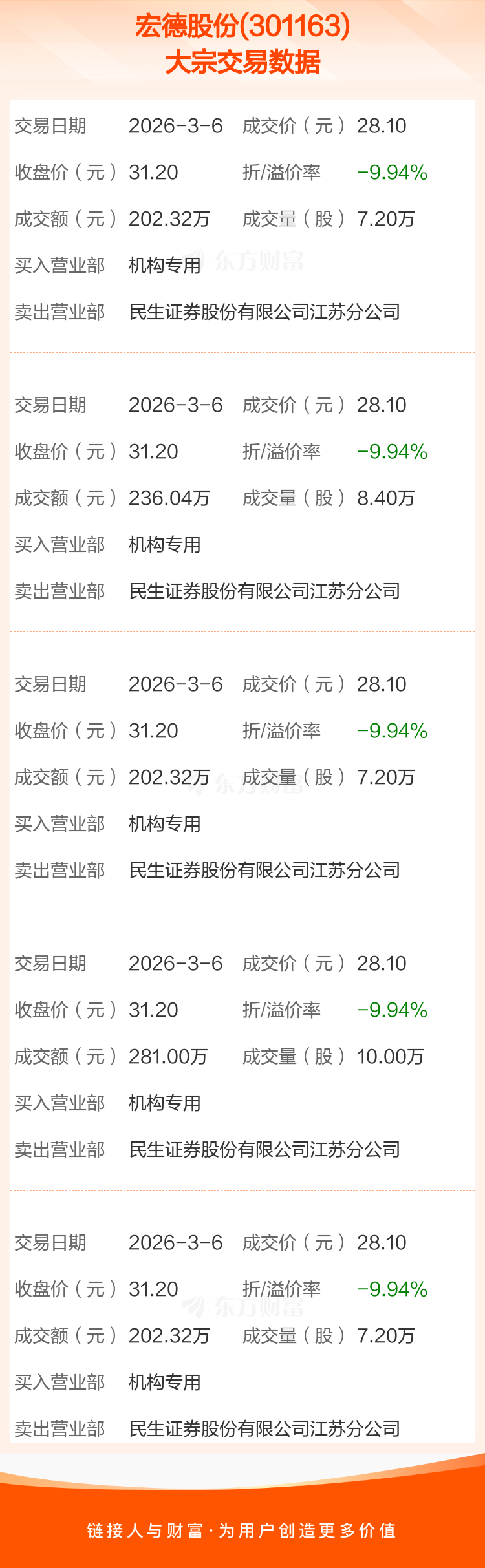 大宗交易:宏德股份成交1124.00万元,折价9.94%(3-6)