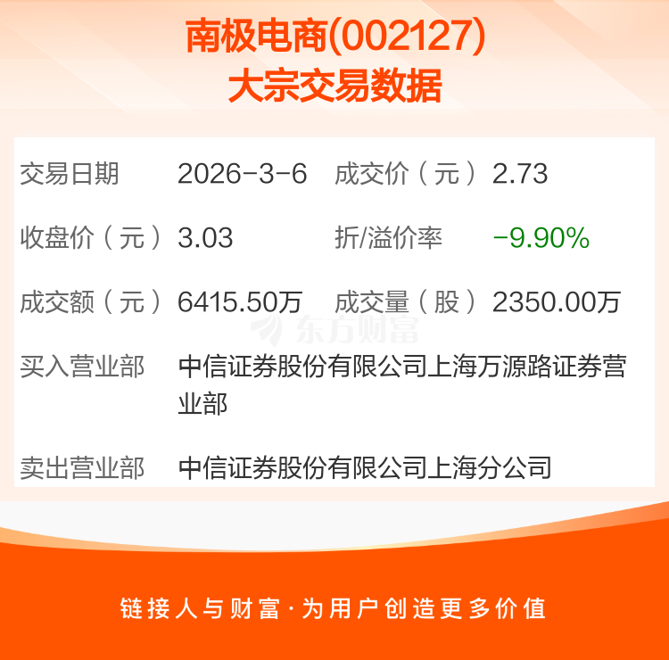 2026年3月6日,南极电商发生1笔大宗交易,共成交2350.00万股,成交金额6415.50万元,占其流通市值比例为1.06%。