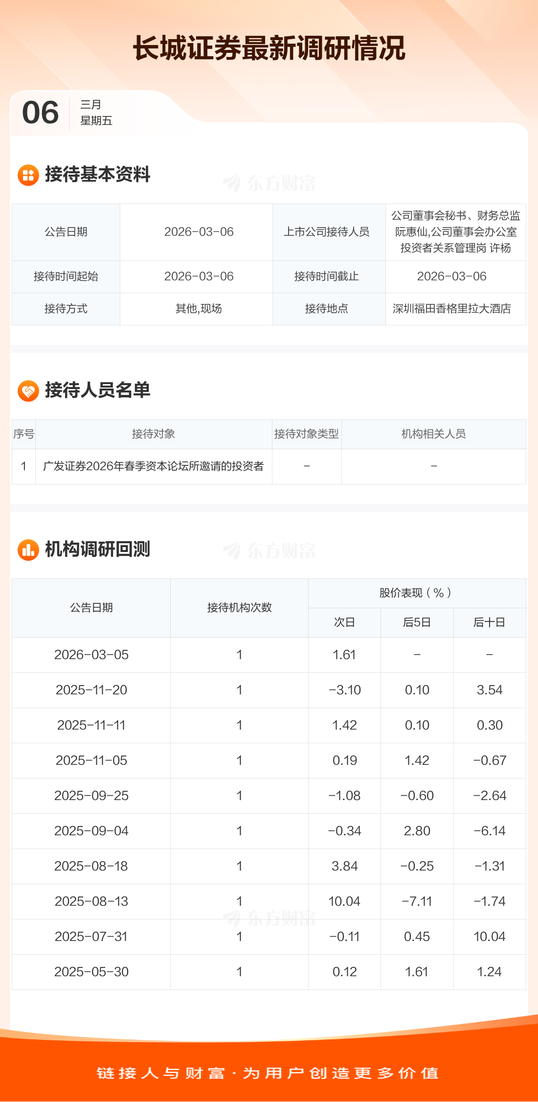 长城证券3月6日公告称,3月6日接待广发证券2026年春季资本论坛所邀请的投资者等1家机构调研。接待人员包括公司董事会秘书、财务总监 阮惠仙,公司董事会办公室投资者关系管理岗 许杨。