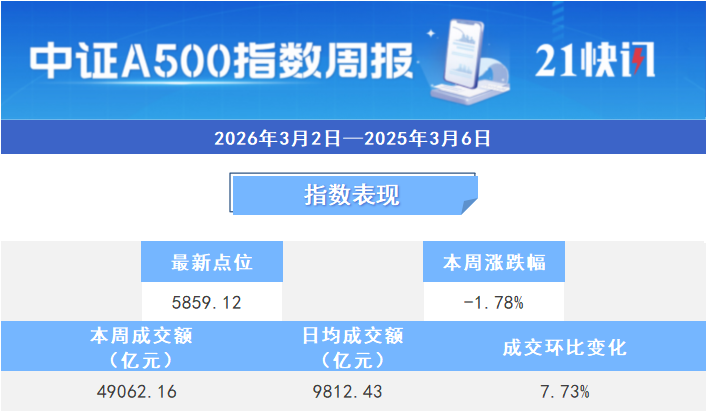 本周中证A500指数下跌1.78%,截至3月6日收盘,报5859.12点。本周日均平均成交额为9812.43亿元,单日成交额环比上涨7.73%。本周40只中证A500基金全线下跌,其中国泰基金的增强型ETF领跌,跌幅为2.21%;国联安的基金跌幅最小,为1.08%。