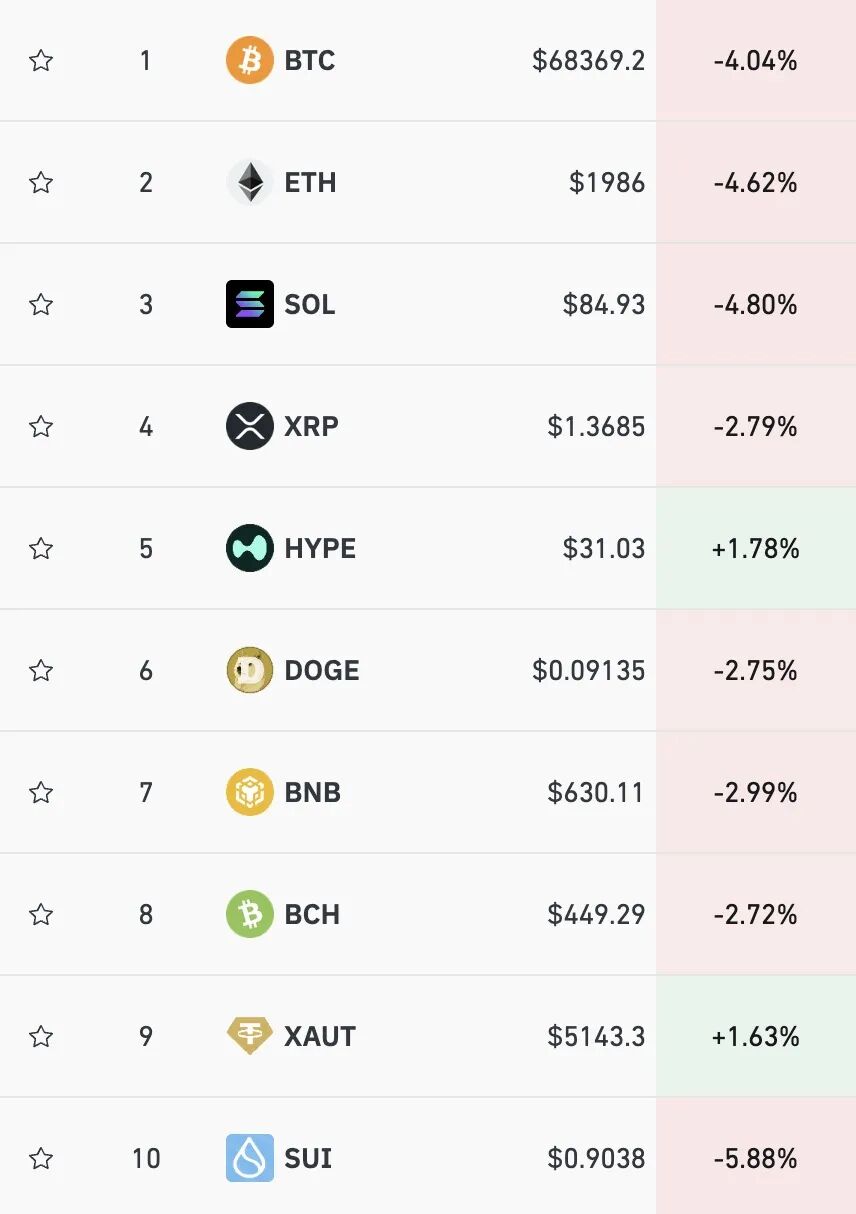 加密货币涨跌不一,比特币报68369美元,跌超4%;以太坊跌至1986美元。