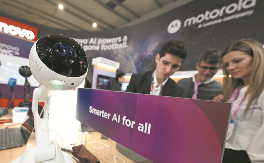 近日,在以智能时代为主题的2026年世界移动通信大会上,来自中国的技术精彩亮相,在人工智能、云平台等领域展示了中国技术的实力。图为工作人员在联想展台交流洽谈。 新华社记者 程敏 摄