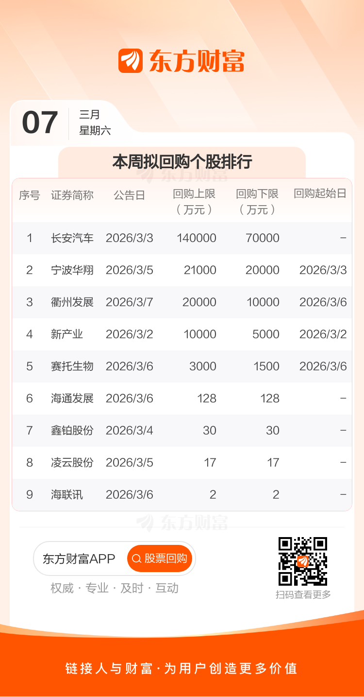 本周有9家公司宣布回购计划,按拟回购金额上限统计,计划回购金额19.42亿元。其中长安汽车拟回购金额上限最高,为14.00亿元。