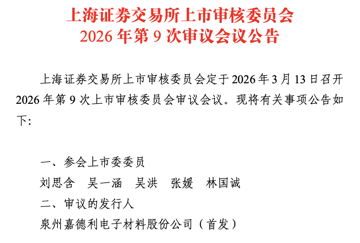 3月6日晚间,上交所官网显示,泉州嘉德利电子材料股份公司(简称“嘉德利”)主板IPO将于3月13日上会迎考。