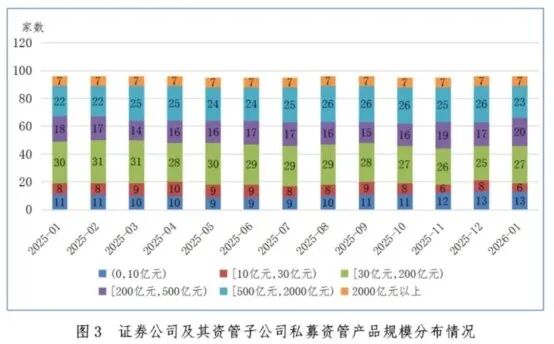 截至2026年1月底,证券公司及其资管子公司平均管理私募资管业务规模为609.51亿元,管理规模中位数为222.36亿元;其中,有7家管理规模在2000亿元及以上,23家管理规模在500亿元到2000亿元区间,20家在200亿元到500亿元。