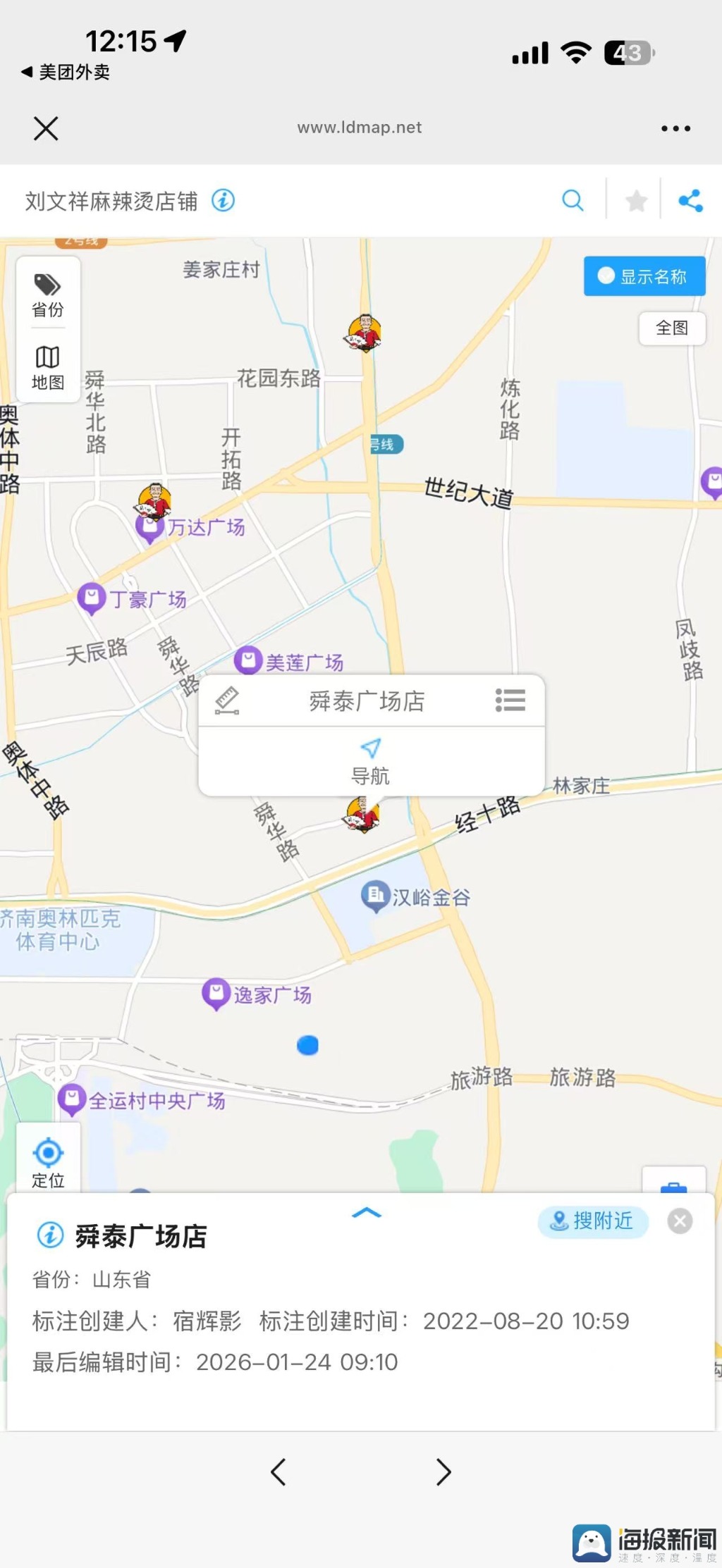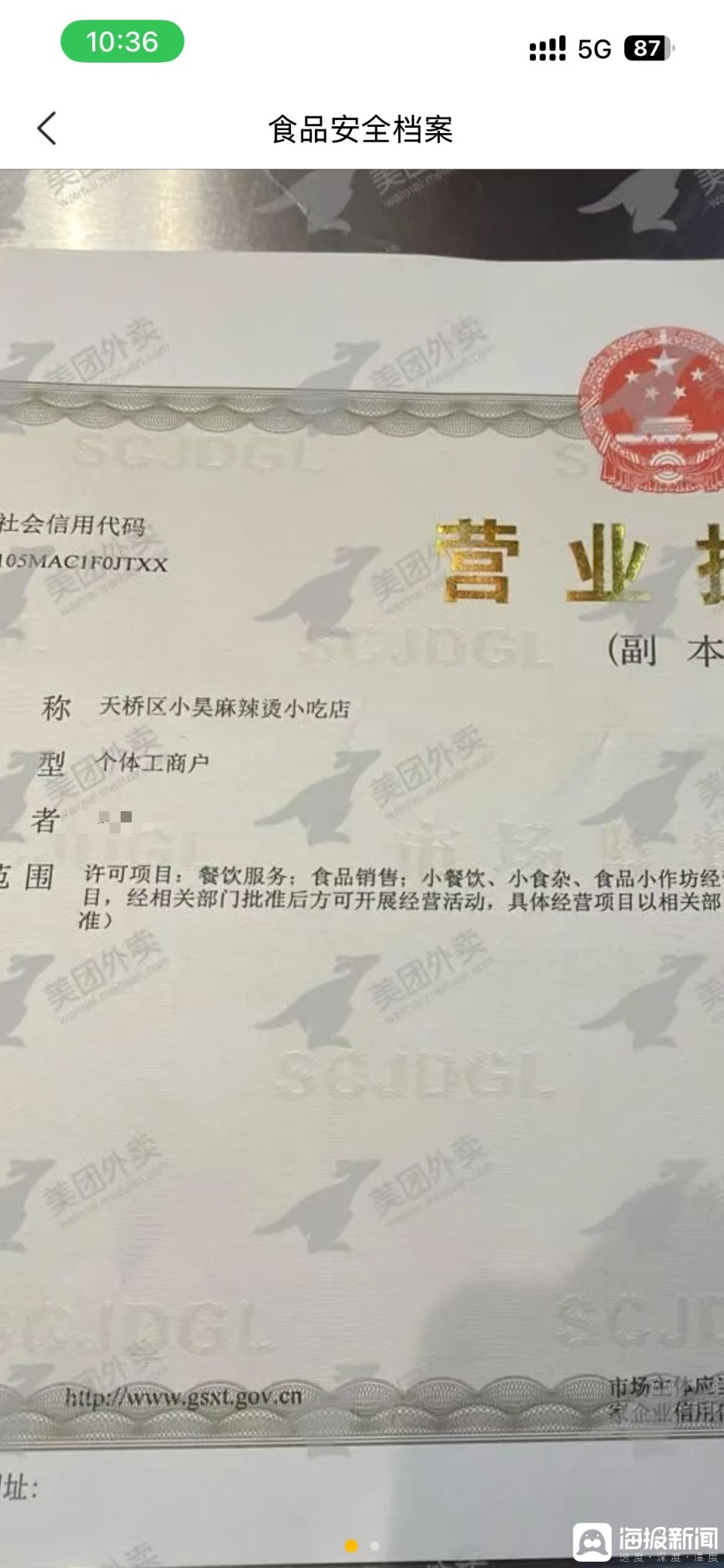 海报新闻记者在外卖平台,随机查看了三家不同头像的刘文祥麻辣烫。门店的工商登记信息、营业执照处,加盟商在工商登记中使用了不同的主体名称,且经营类型多为“个体工商户”,组织形式都为个体经营。比如,一家济南市历下区的刘文祥麻辣烫的营业执照显示名称为“济南历下新东麻辣烫”;一家位于济南市天桥区的门店营业执照显示名称为“天桥区小昊麻辣烫小吃店”。工商信息名称均未体现“刘文祥”,无法通过工商信息来给出“真假”刘文祥的答案。但记者从刘文祥麻辣烫官方网站中的门店信息详览中,均查询到了以上加盟店铺的信息,上述店铺确为官方授权的加盟店铺。