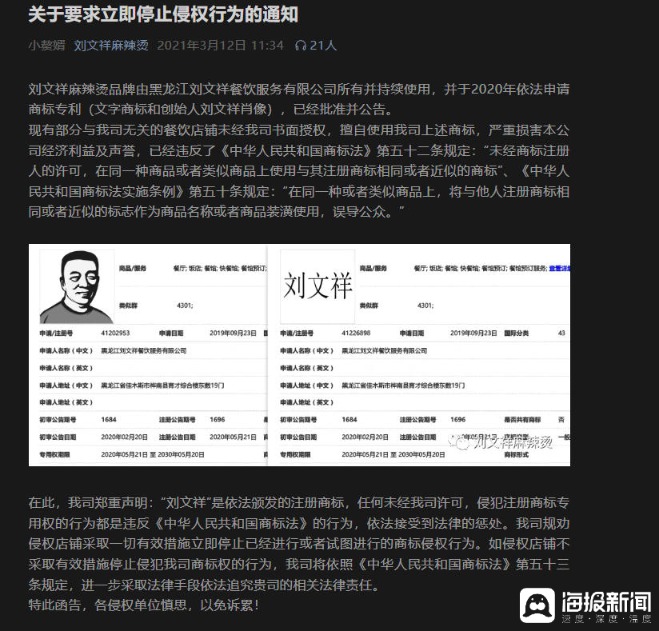 同时,在2021年3月份,其官方微信公众号再发文章表示,刘文祥麻辣烫品牌由黑龙江刘文祥餐饮服务有限公司所有并持续使用,并于2020年依法申请商标专利(文字商标和创始人刘文祥肖像),已经批准并公告,要求未授权店铺停止使用该公司商标的侵权行为。