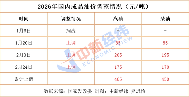 中新经纬注意到,今年以来,国内油价已经历四轮调价窗口,总体格局为“三涨一搁浅”。若本轮调价如预期上调,2026年调价格局将变为“四涨一搁浅”,也是年内连续第四次涨价。