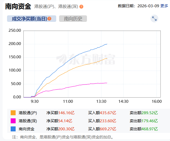 截至目前,南向资金净买入额达200亿港元。