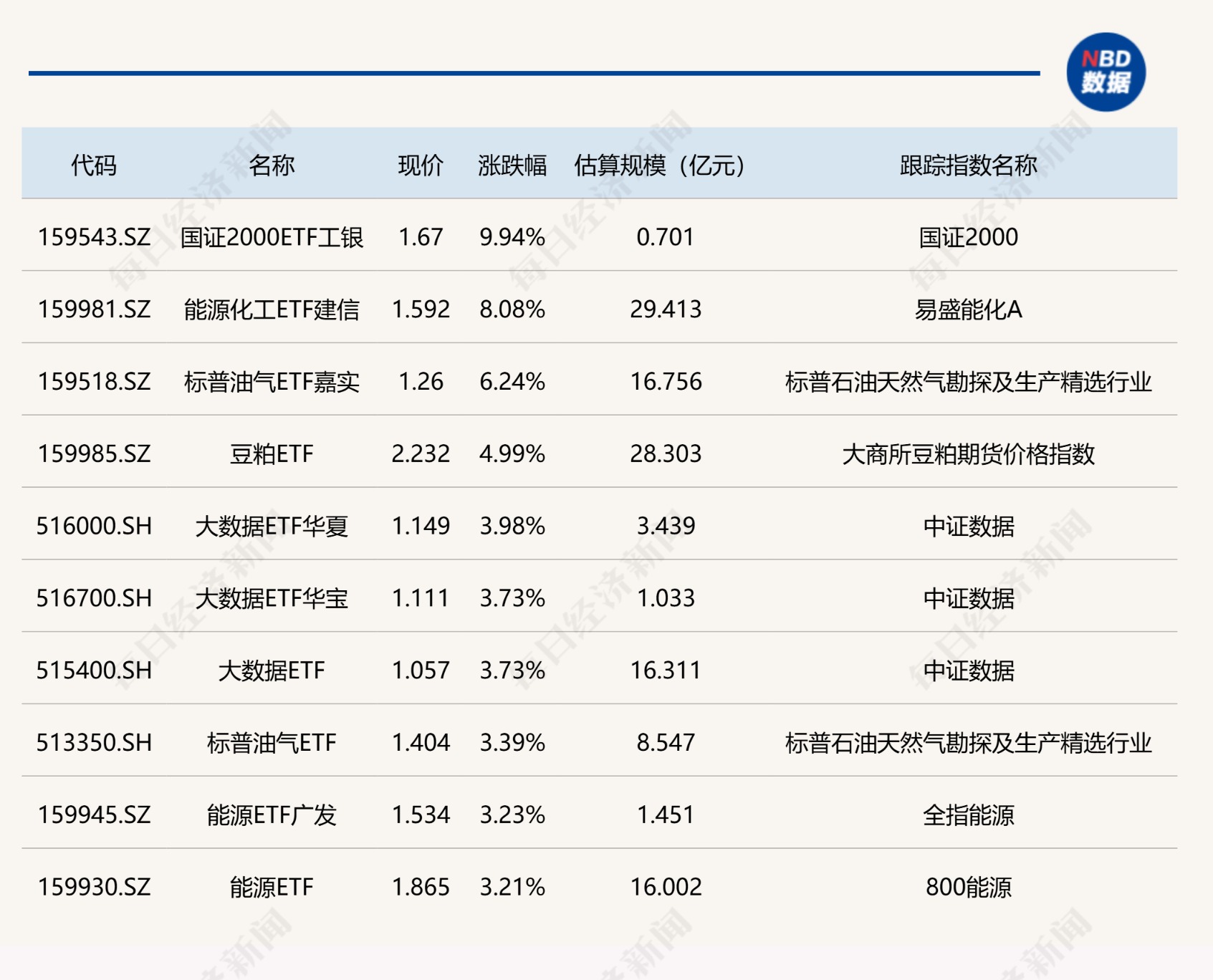 ETF涨跌幅方面,国证2000ETF工银涨超9%,能源化工ETF建信涨超8%。