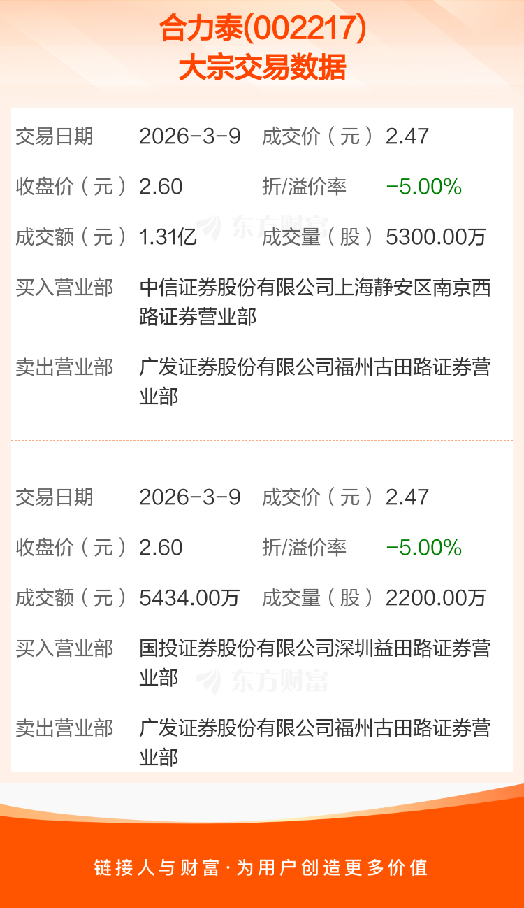 2026年3月9日,合力泰发生2笔大宗交易,共成交7500.00万股,成交金额1.85亿元,占其流通市值比例为0.98%。