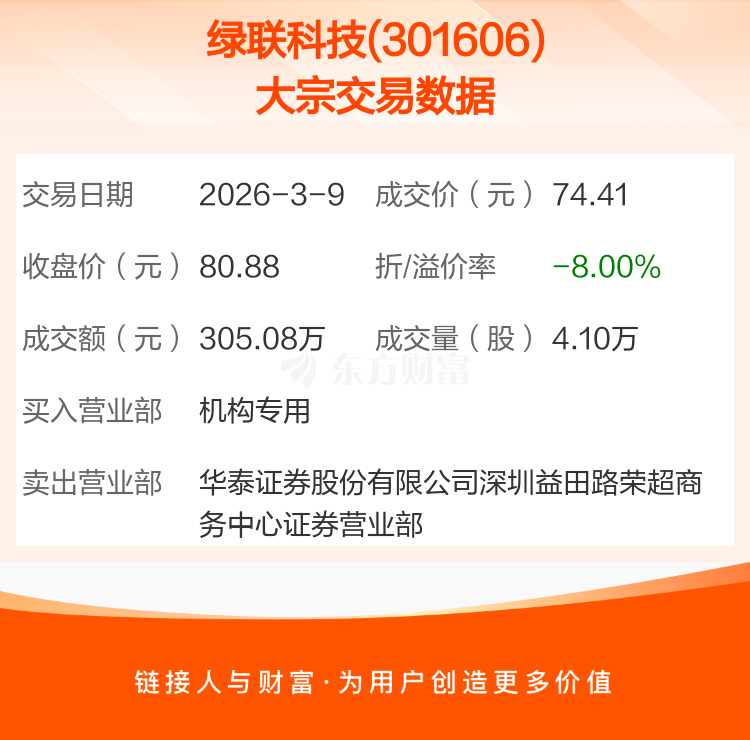 大宗交易:绿联科技成交305.08万元,折价8.00%(3-9)