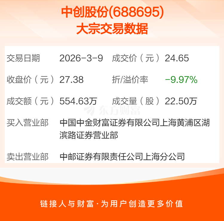 大宗交易:中创股份成交554.63万元,折价9.97%(3-9)