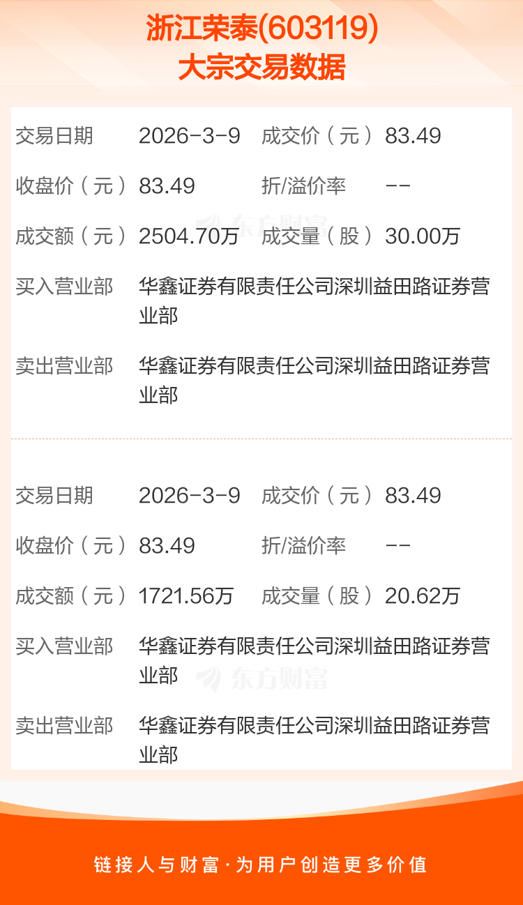 2026年3月9日,浙江荣泰发生2笔大宗交易,共成交50.62万股,成交金额4226.26万元,占其流通市值比例为0.25%。