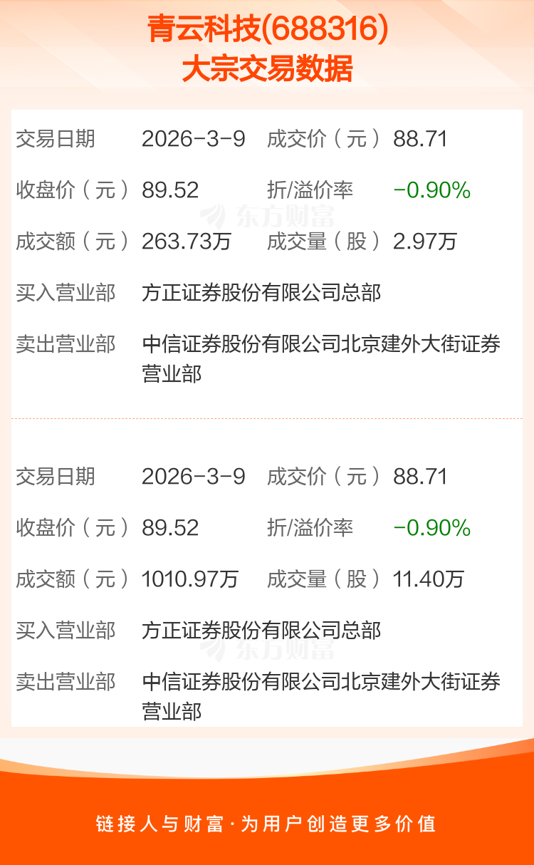 2026年3月9日,青云科技发生2笔大宗交易,共成交14.37万股,成交金额1274.70万元,占其流通市值比例为0.30%。