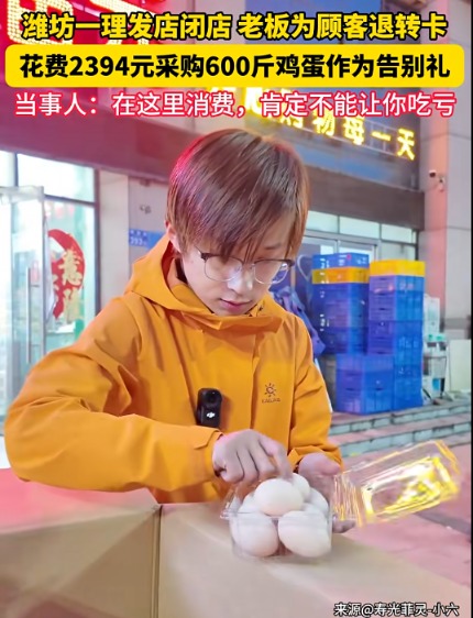 3月2日,潍坊寿光一家理发店宣布闭店,老板没有“卷款跑路”,而是主动联系办卡顾客退转卡内余额,甚至还自掏腰包购买了600斤鸡蛋作为告别礼分发给大家。