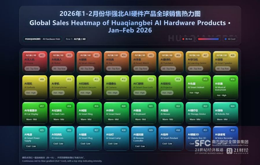 2026年,华强北AI产品占比已从2023年的12%升至41%。近两月,华强北的AI眼镜等AI产品都销量激增。