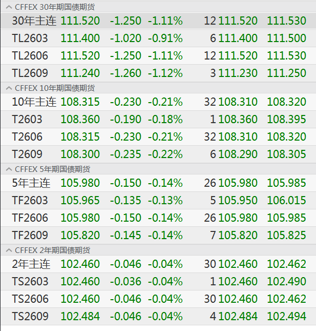 3月9日,国债期货收盘全线下跌,30年期国债期货主力合约跌1.11%,创近7个月最大跌幅;10年期国债期货主力合约跌0.21%,创逾两个月最大跌幅;5年期国债期货主力合约跌0.14%,2年期国债期货主力合约跌0.04%。