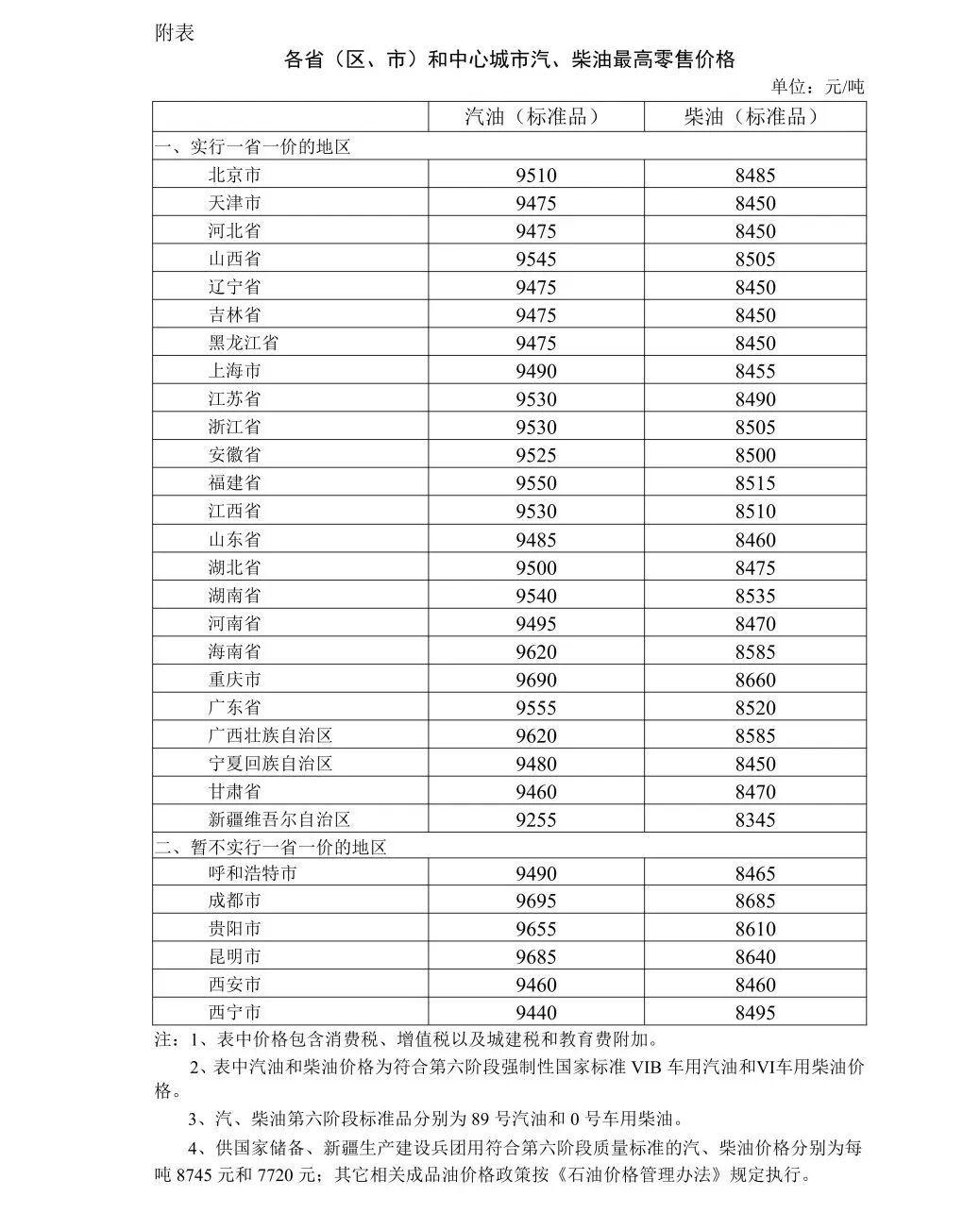 近期国际市场油价震荡上升。根据3月9日的前10个工作日平均价格与上次调价前10个工作日平均价格对比情况,按照现行成品油价格机制,自3月9日24时起,国内汽、柴油价格(标准品,下同)每吨分别上涨695元和670元。调整后,各省(区、市)和中心城市汽、柴油最高零售价格见附表。