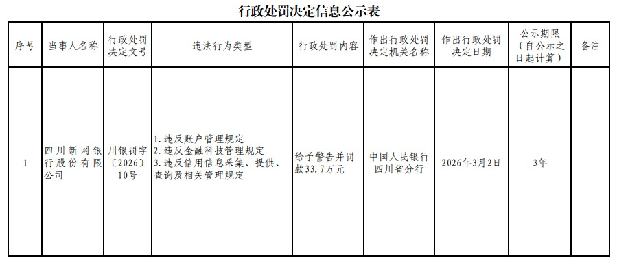 近日,中国人民银行四川省分行行政处罚决定信息公示表显示,四川新网银行股份有限公司因“违反账户管理规定,违反金融科技管理规定,违反信用信息采集、提供、查询及相关管理规定”等3项违法行为,受到警告并被罚款33.7万元。
