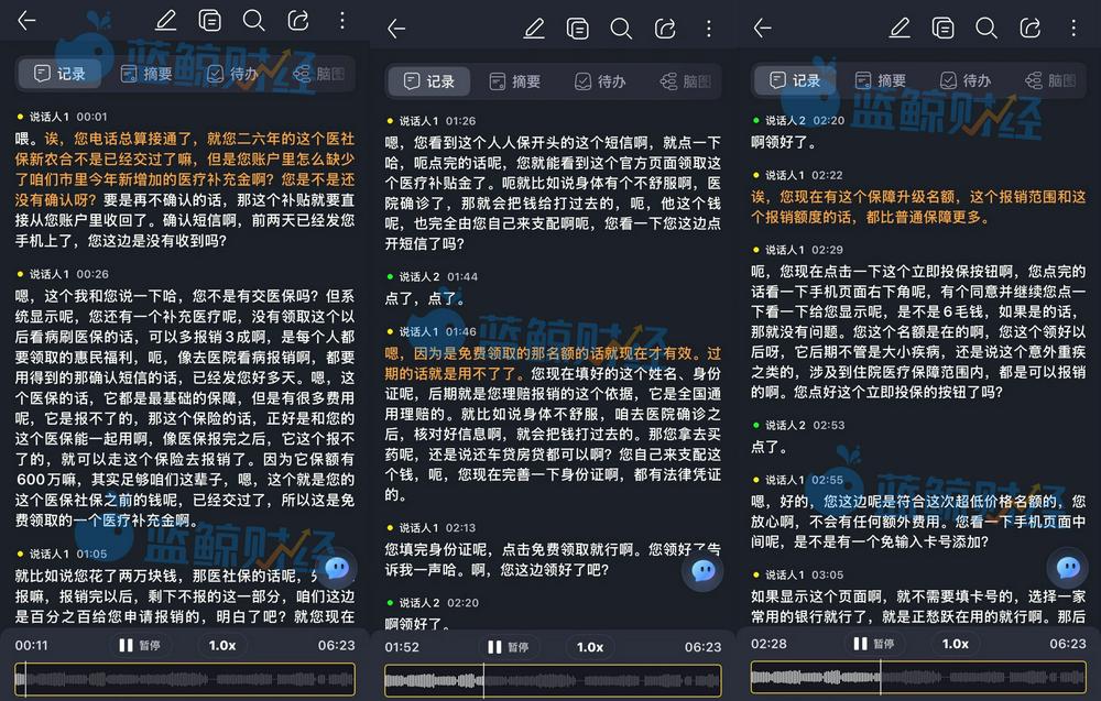 彭悦提供给记者的一段电话录音中,对面的销售人员话术如下:“您的电话总算接通了!您26年的医保新农合已经交过了,但是账户缺少今年市里新增的医疗补充金,您是不是还没有确认呀?要是再不确认的话,补贴就要直接从您的账户里收回了。”