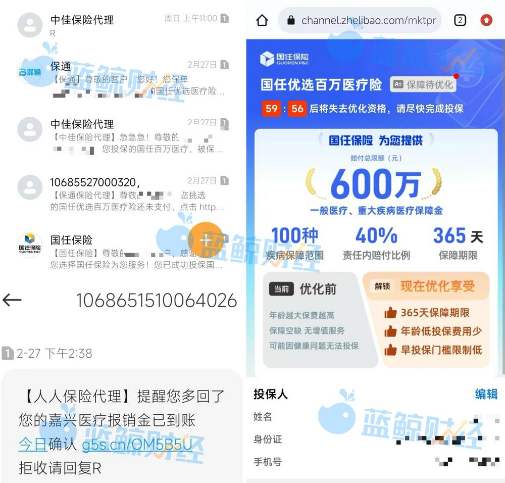 这类来电多以400号码或外地座机呼出,连线人员以“医保二次报销”“惠民医疗升级”为名,诱导用户关注“xx保”类公众号并点击链接“免费领保险”。有部分用户领取免费赠险,另有部分用户支付0.6元费用后以为流程结束,数月后却发现银行卡被自动持续扣费,每月从几十元到上百元不等。另有多位受访者表示,频繁收到该类骚扰电话,拉黑多个号码仍有新号反复拨打。记者实测流程后,一周内收到12通推销电话,7条推销短信。