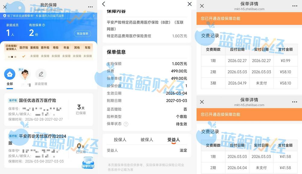 后续,他发现银行卡每月都出现一笔不明扣费,总计约100元。查询后才知道自己投保了国任优选百万医疗险和平安药诊无忧医疗险:前者已交两期费用,1期支付0.99元,2期支付58.1元;后者已交1期费用,支付41.58元。