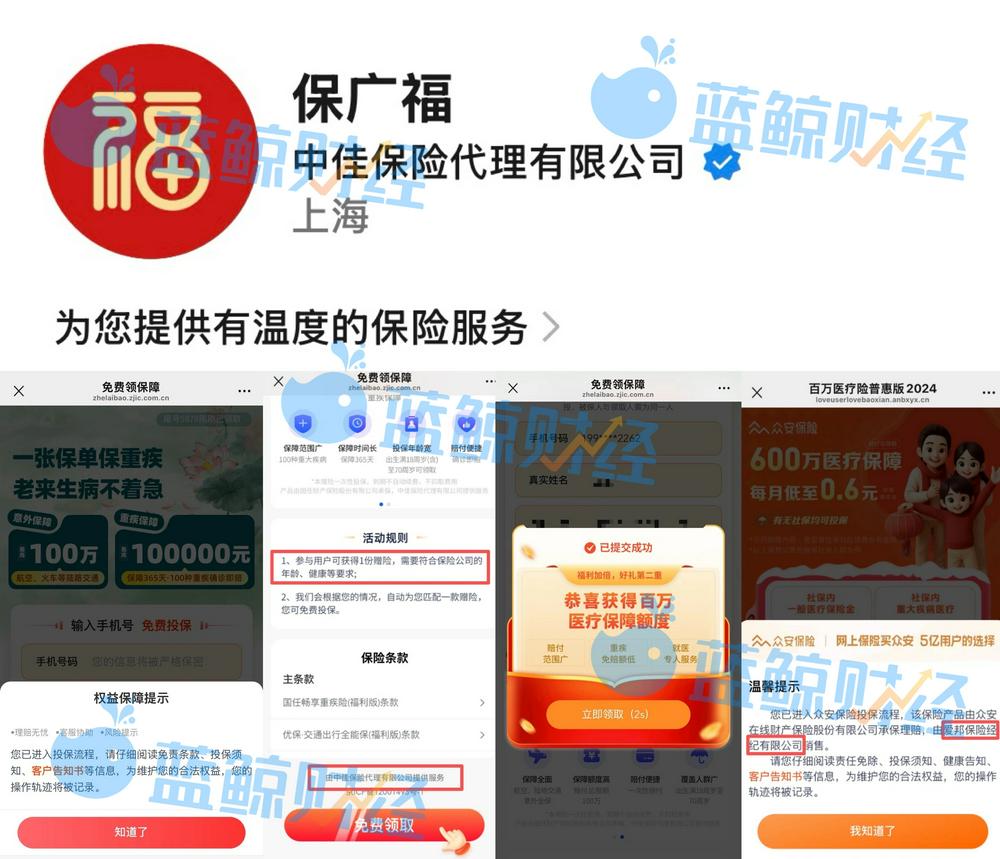 值得关注的是,记者通过中佳保险代理运营的“保广福”公众号实测发现,“免费领取保障”界面显示服务主体为中佳保险代理,可跳转至投保页面后,实际销售主体却变为爱邦保险经纪,疑似两家机构合作引流。