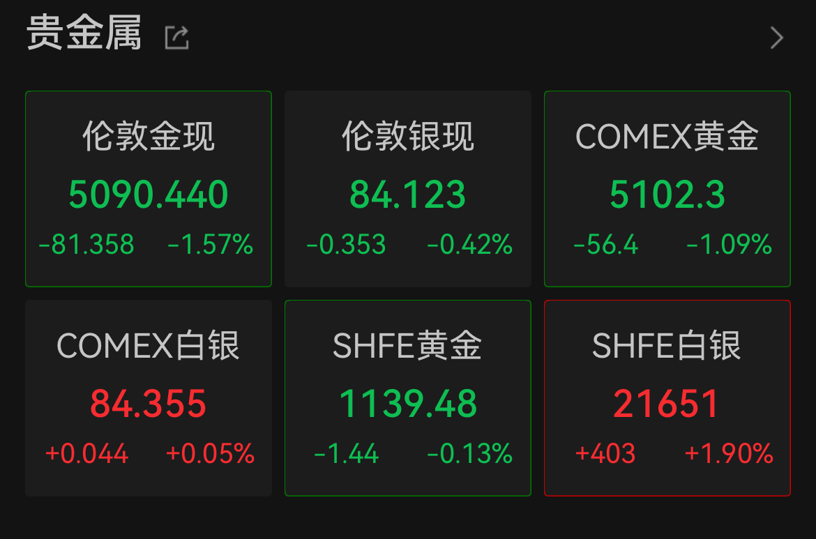 黄金、白银方面,现货黄金跌幅仍然较大,截至发稿跌超1.5%;现货白银短线拉升,盘中一度翻红,但随后再度下挫,截至发稿跌0.42%。