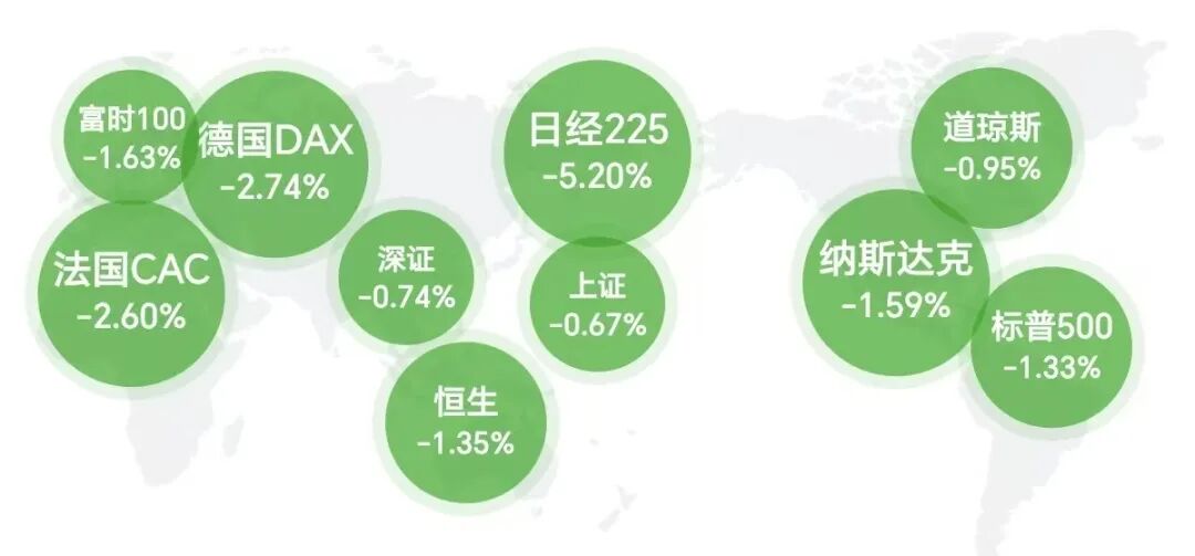 周一日韩股市开盘大跌,日经225指数盘中一度下跌4000点;韩国KOSPI指数也一度下跌8%,再度触发熔断机制。截至收盘,日经225指数跌大跌超5%,下跌近3000点,韩国KOSPI指数大跌近6%。