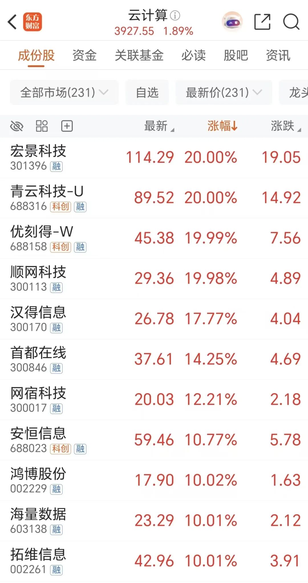 而在大盘走跌的情况下,云计算板块周一异军突起,宏景科技、青云科技、优刻得等多股20CM涨停,汉得信息、网宿科技等多股涨超10%。