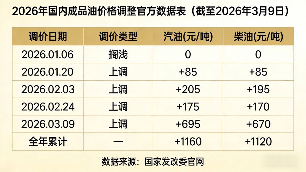 据卓创资讯测算,本轮成品油零售限价上调确认后,私家车加满一箱50L的92#汽油将多花27.5元,私家车方面,以月跑2000公里,百公里平均油耗8L的燃油汽车为例,下次调价窗口开启前(2026年3月23日24时),单辆车的燃油成本将增加41元左右。物流行业以月跑10000公里,百公里油耗在38L的重型卡车为例,在下次调价窗口开启前,单辆车的燃油成本将增加1011元左右,群众驾车出行燃油成本及物流运输燃油成本将上升。