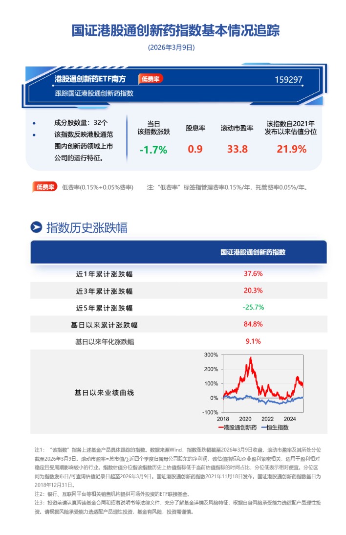 截至2026年3月9日收盘,港股通创新药ETF南方(159297)换手6.69%,成交1.05亿元,跟踪指数国证港股通创新药指数收跌1.7%。