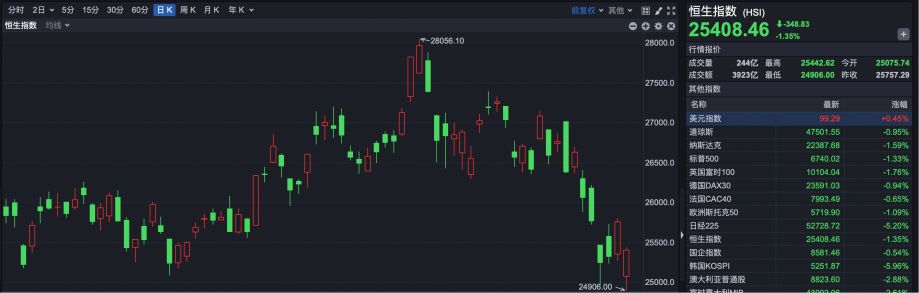 截至收盘,恒生指数报25408.46点,下跌348.83点,跌幅1.35%。今日盘中,恒指一度跌至24906点,最大跌幅3.31%。