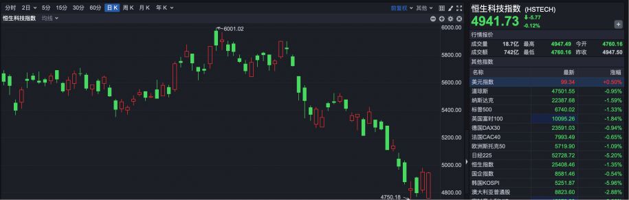 恒生科技指数表现更强,早盘低开3.79%,随后一路上行,最终收盘报4941.73点,仅下跌5.77点,跌幅0.12%。
