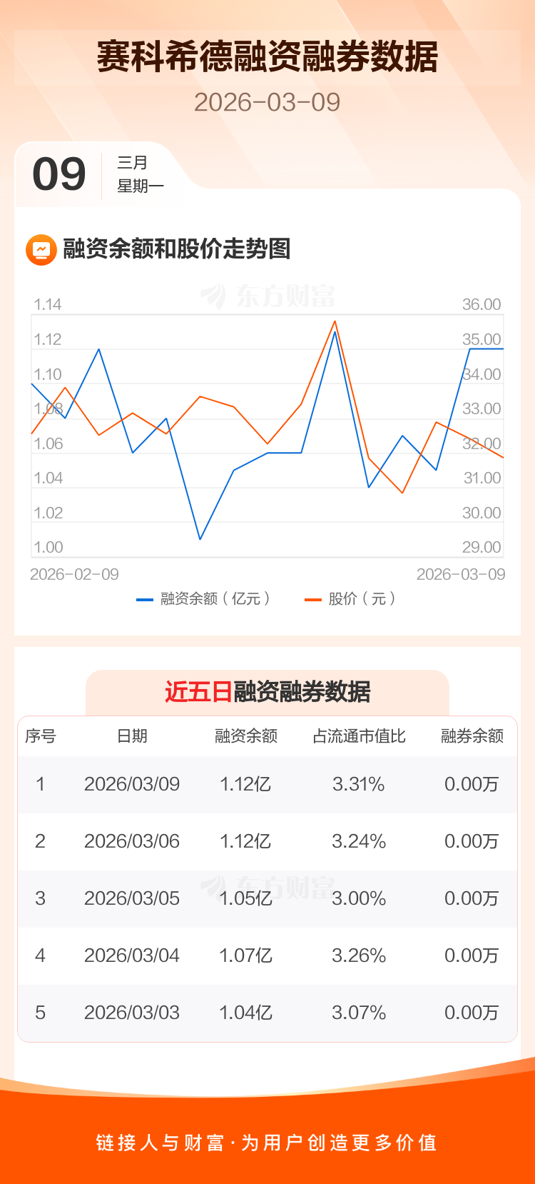 交易所最新数据显示,赛科希德于2026年3月9日获融资买入1113.46万元,融资偿还1069.66万元,当日融资净买入43.81万元。目前,该股融资余额1.12亿,占流通市值比例为3.31%。