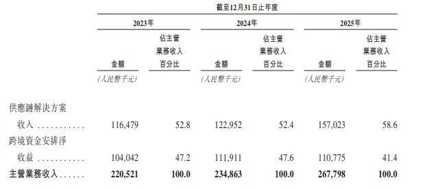 招股书显示,Hope Sea的收入来源分为供应链解决方案收入和跨境资金安排净收益两部分。其中,跨境资金安排净收益占公司收入的比例常年超过40%。2023财年至2025财年,Hope Sea来自跨境资金安排业务的收入分别为约1.04亿元、1.12亿元、1.11亿元,分别占公司同期主营业务的总收入的约47.2%、47.6%、41.4%。