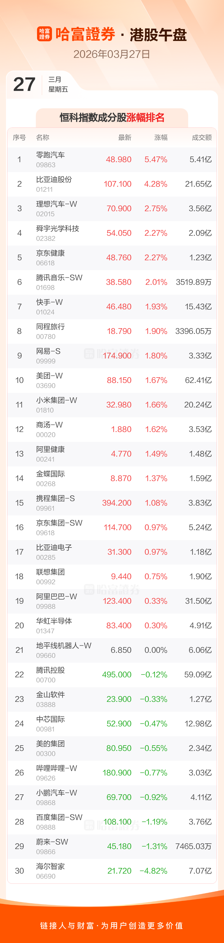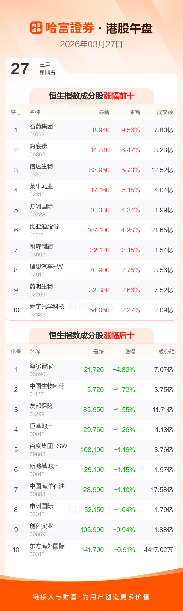 港股3月27日午盘走高,恒生指数收报24992.06点,涨135.63点,涨幅0.55%;恒生科技指数收报4811.54点,涨50.0点,涨幅1.05%。恒生指数成分股中石药集团、海底捞、信达生物涨幅居前,海尔智家、中国生物制药、友邦保险跌幅靠前。恒生科技指数成分股中零跑汽车、比亚迪股份、理想汽车-W涨幅居前,海尔智家、蔚来-SW、百度集团-SW跌幅靠前。