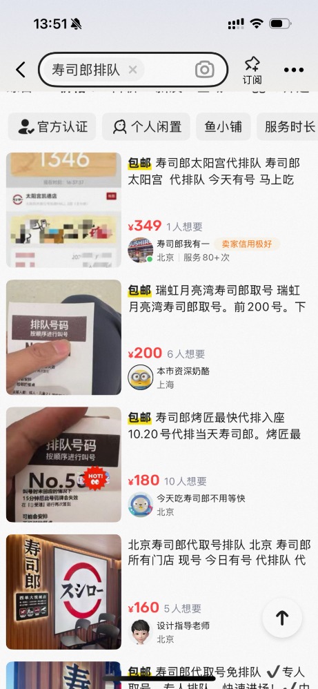 二手交易平台显示,寿司郎“代排队”价格普遍在30元—50元不等,有些价格甚至达到150元—300元。