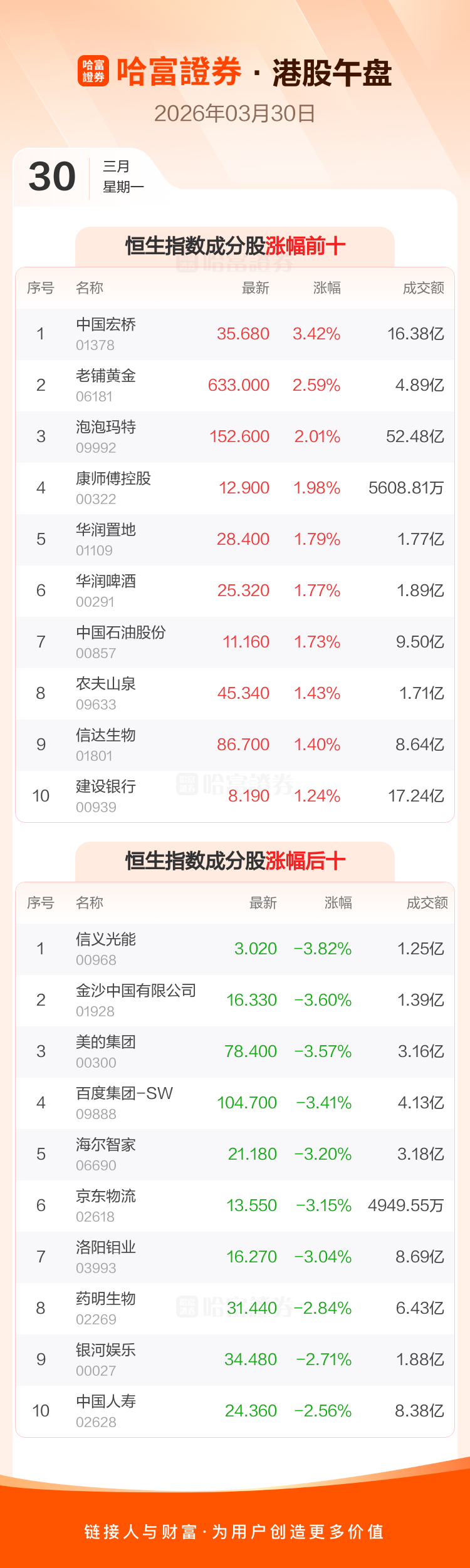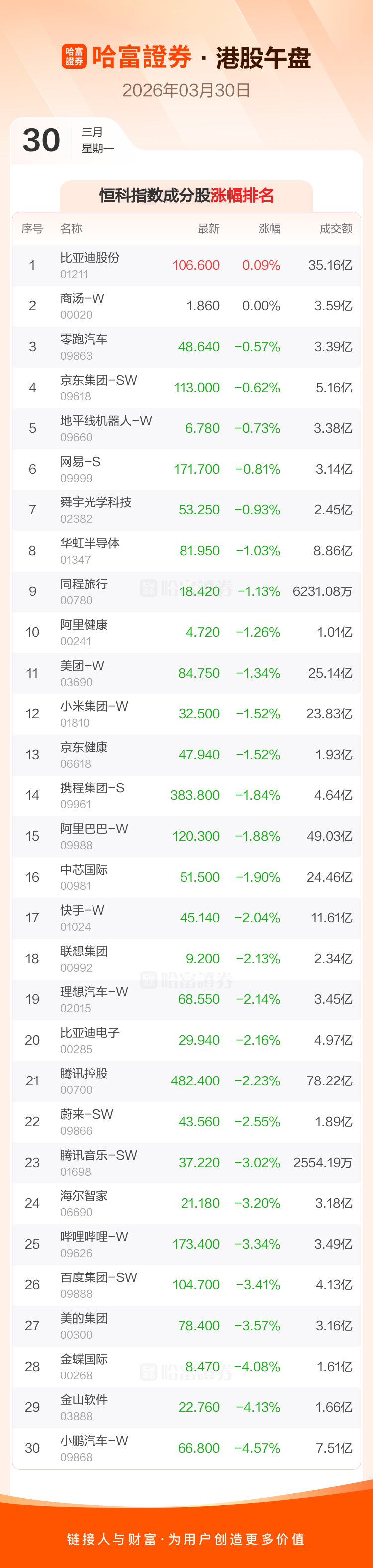 港股3月30日午盘走低,恒生指数收报24727.84点,跌224.04点,跌幅0.9%;恒生科技指数收报4698.51点,跌79.5点,跌幅1.66%。恒生指数成分股中中国宏桥、老铺黄金、泡泡玛特涨幅居前,信义光能、金沙中国有限公司、美的集团跌幅靠前。恒生科技指数成分股中比亚迪股份涨幅居前,小鹏汽车-W、金山软件、金蝶国际跌幅靠前。