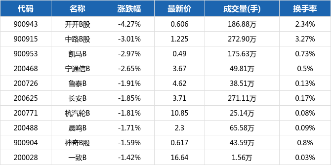 个股跌幅榜方面,开开B股(-4.27%)、中路B股(-3.01%)、凯马B(-2.97%)跌幅居前。