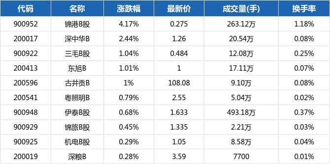 个股涨幅榜方面,锦港B股(4.17%)、深中华B(2.44%)、三毛B股(1.04%)涨幅居前。