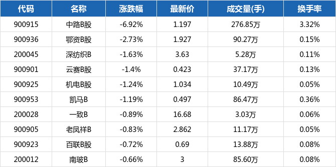 个股跌幅榜方面,中路B股(-6.92%)、鄂资B股(-2.73%)、深纺织B(-1.63%)跌幅居前。