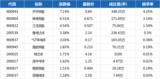 个股涨幅榜方面,开开B股(7.14%)、神奇B股(6.51%)、三毛B股(4.54%)涨幅居前。
