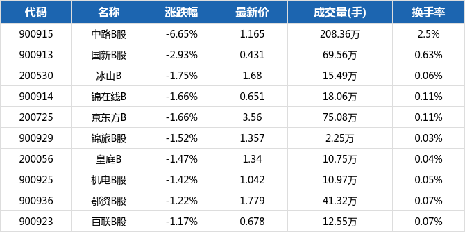 个股跌幅榜方面,中路B股(-6.65%)、国新B股(-2.93%)、冰山B(-1.75%)跌幅居前。