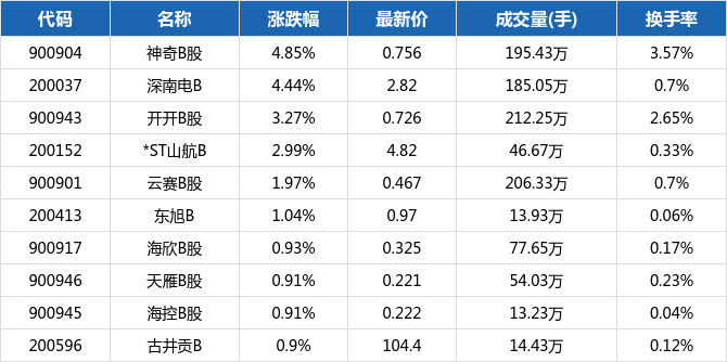 个股涨幅榜方面,神奇B股(4.85%)、深南电B(4.44%)、开开B股(3.27%)涨幅居前。